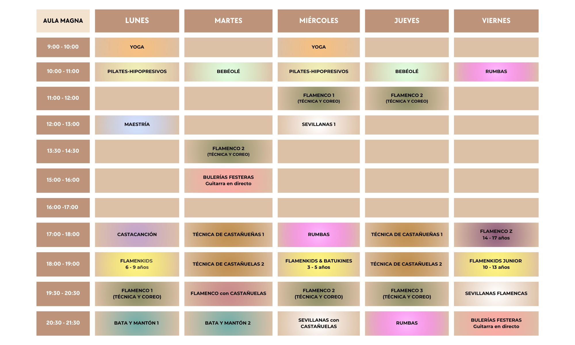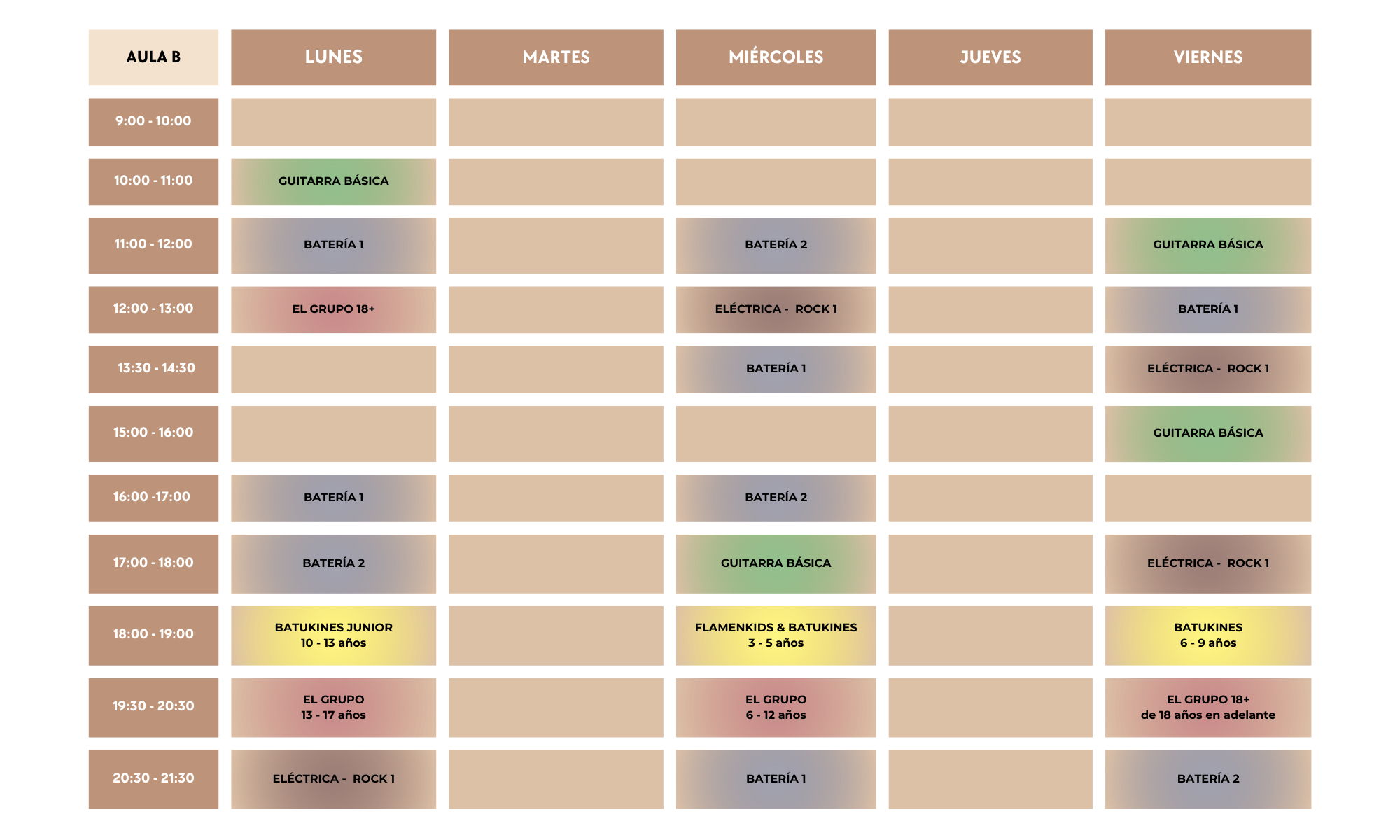 Todas las actividades grupales a las que puedes unirte, organizadas por aulas.